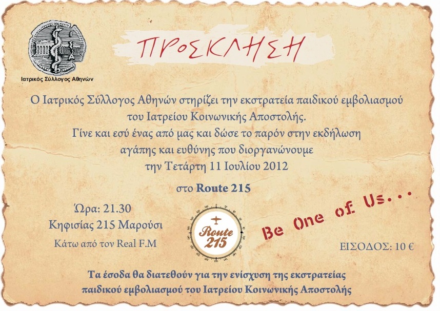 Ο Ιατρικός Σύλλογος Αθηνών ,στο πλαίσιο των δράσεων που υλοποιεί με σκοπό τη στήριξη των ευπαθών ομάδωνπολιτών, διοργανώνει την ερχόμενη Τετάρτη 11 Ιουλίου 2012, στις 21:00 ( Route 215, Κηφισίας 215 , Μαρούσι) , μια ιδιαίτερη εκδήλωση φιλανθρωπικού χαρακτήρα.
